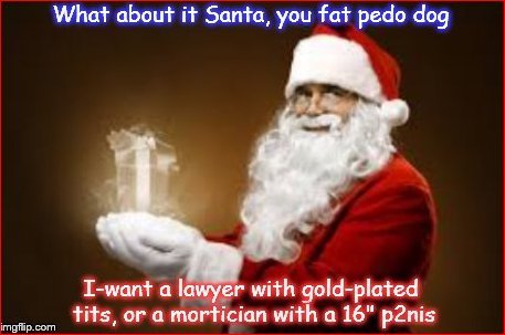Myself, I’m in dire straits from the same crims who pulled the Dealey Plaza thing (Really) yet I’ve not given up hope things will work out ~ I’m going to ask Santa for a lawyer with gold plated tits, or a mortician with a 16″ p2nis ~