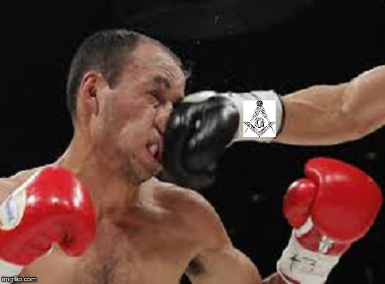 See this photo below? ~ It’s pretty heavy ~ It’s not actually the glove that’s causing that distortion of the man’s face and all of the muscles in his head, it’s merely the taped fist inside of the glove doing it cause that glove is only there for the ride ~ So it is with World Freemasonry ~ It’s what’s within it that does things 😉