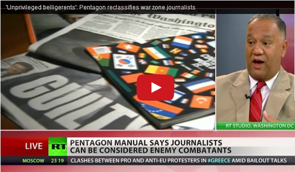 The Pentagon has released a book of instructions on the “law of war,” detailing acceptable ways of killing the enemy. The manual also states that journalists can be labeled “unprivileged belligerents,” an obscure term that replaced “enemy combatant.” The 1,176-page “Department of Defense Law of War Manual” explains that shooting, exploding, bombing, stabbing, or cutting the enemy are acceptable ways of getting the job done, but the use of poison or asphyxiating gases is not allowed. Surprise attacks and killing retreating troops have also been given the green light. But the lengthy manual doesn’t only talk about protocol for those on the frontline. It also has an extensive section on journalists – including the fact that they can be labeled terrorists. “In general, journalists are civilians. However, journalists may be members of the armed forces, persons authorized to accompany the armed forces, or unprivileged belligerents,” the manual states. The term “unprivileged belligerents” replaces the Bush-era term “unlawful enemy combatant.”