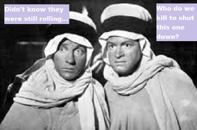 This reminds me of a non-existent deleted scene from an old unreleased Bob Hope Bing Crosby version of the road movie “The Road to Kabul” where Bing and Bob stop off at Tel Aviv to pick up president Donald Trump’s winnings from one of his failed Atlantic City casinos, and while there Bob Hope fellates Bing as the entire Afghan Islamic boy’s choir sings a heart-rending rendition (sic) of the Star Spangled Banner and all the gold bullion slowly disappears from repositories in Iraq and Libya…