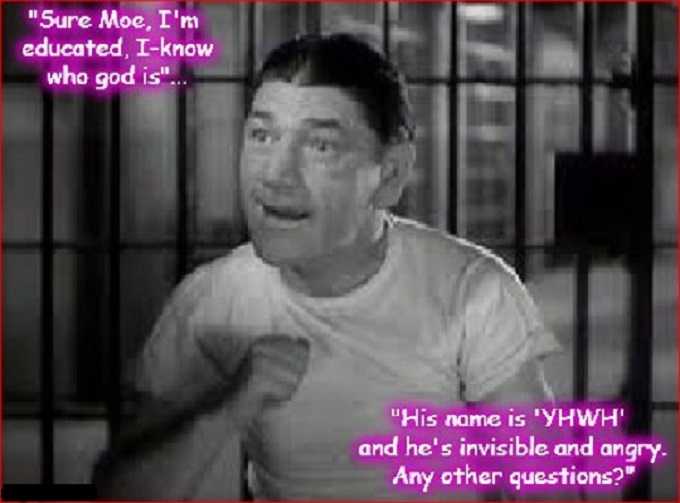 Those who are of the chosen race will likely call him ‘YHWH’ which, if you’ll please note is unpronounceable unless you stick some vowels in meaning in reality they’re not going to call him anything at all, you’ll just think they are and they’ll have tricked you, because they’re sneaky fcuk’s too…