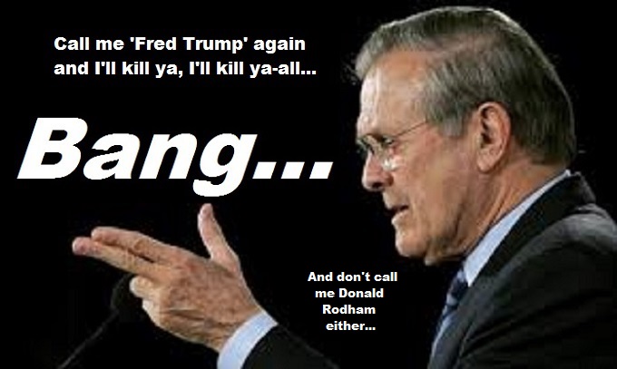 Speaking of those who run your country, Donald Rumsfeld once told me in person back in the 1970’s about one of his illegitimate sons name of Donald ‘Drumpf’ ~ No shit, first thing I’d said was, “Well, the name’s gotta go” 😉