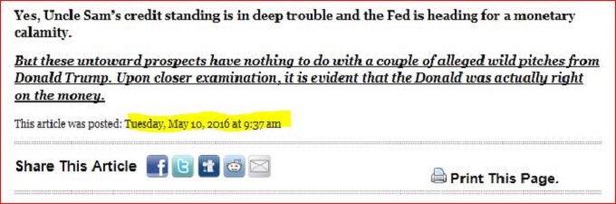 Donald Trump says a lot of whacko things, and his recent wild pitches about defaulting on the national debt and replacing Yellen because she is not a Republican sound as if they were coming right out of his wild man wheelhouse. Certainly these statements have gotten mainstream financial journalists and editorial writers in high dudgeon. Said the NYT editorial page about Trump’s observation that if things got bad enough he’d seek to negotiate “discounts” on Uncle Sam’s towering debt,