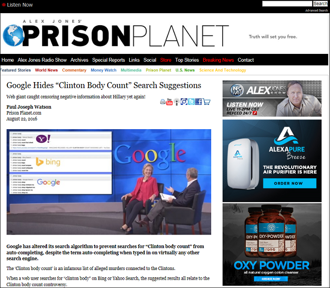 However, search for the same term on Google and “clinton body” only returns suggestions related to auto-repair shops, and nothing to do with the Clinton body count. Go ahead, try it for yourself. […]
