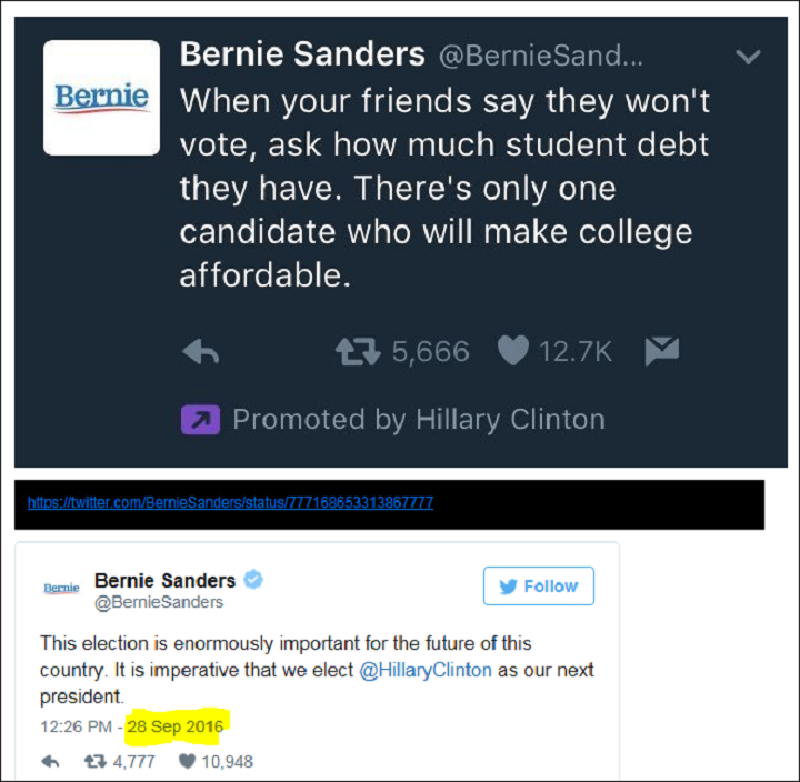 This is sad to see. Like many others, I had a grudging respect for Bernie Sanders in the past. But the way he has cucked himself where Hillary Clinton is concerned is pretty pathetic. I never expected him to endorse Trump, or anything like that, but he’s now in full grovel mode. And the Clintons are taking full advantage of his debasement. Take a look at the tweet from him Hillary Clinton has actually paid to have promoted around Twitter: