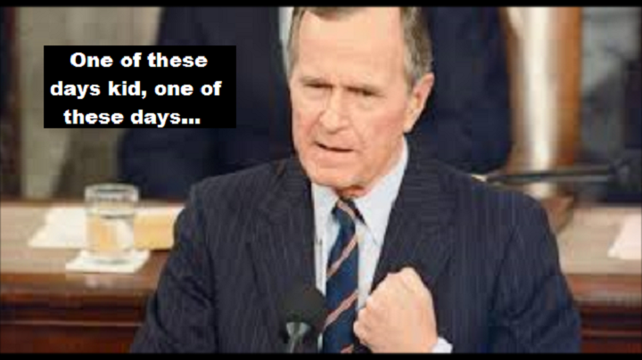 So after this next time I’d spoken to your future 41st president, I’d said to him straight out “I-WANT JUSTICE GEORGE” in what I’d hoped was my most stubborn assertive tone, quite the little man, but his reply was dishonest, he said “Ah kid, you don’t even know what the word means” so I’d immediately fired back “YES I-DO, YOU GET MONEY AND YOU USE THE MONEY TO MAKE THEM NOT DO WHAT YOU DON’T WANT THEM TO ANYMORE” and the asshole just said, “Who told you that, kid?”