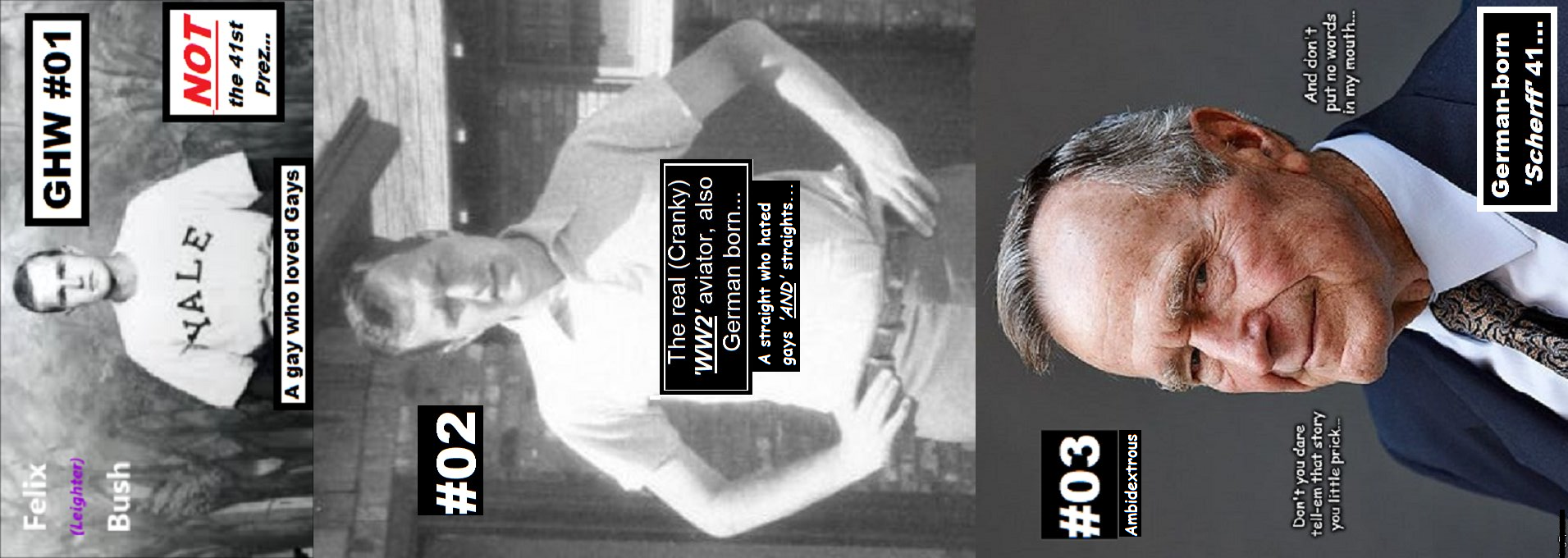Waaa Ha-Ha, at one stage the original American born Bush, (Not a Scherff), the gay Yale baseball player one, was called Debbie as in “Debbie does Dallas” which was a kinky ‘JFK’ assassination pun, while his lookalike brother (Another Scherff) was called “BUTCH“ of all things because he bristled with anger any time someone deliberately or accidentally referred to him as the American born gay one, just try to remember tho, one American born ‘GHW’ plus two German born sons of Prescott…