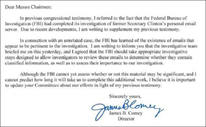 FBI director James Comey’s letter to congressional committee chairs
