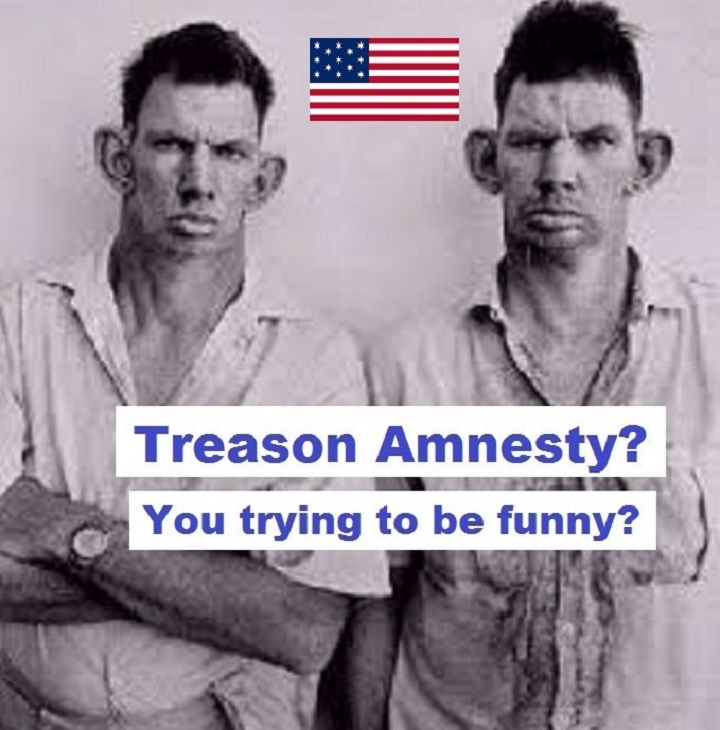 get this into your thick skulls, anyone turning down the amnesty, anyone refusing to testify, “Taking the 5th” you call it, who then gets found guilty of treason, or anyone who takes the amnesty but then gets caught out lying by the collective testimony of those who took the amnesty, give them a lawful firing squad comprising crippled army veterans before hanging those pieces of treasonous crap by the neck to a Merry Go Round with this music playing 24\7 till their corpses rot and drop off the ropes, then leave them there till judgment day…