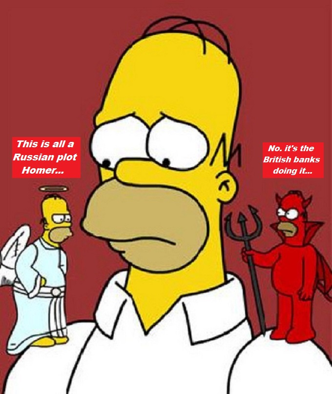 And it’s “All a Russian plot” the little Trump on my shoulder said… Then the other Trump, the bad one, he said it was British banks… I’m so confused, won’t someone “Paleeese” elect Hillary Clinton…