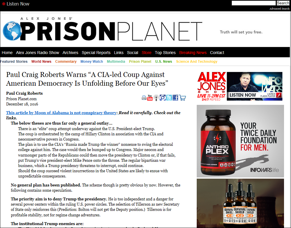 There is an “elite” coup attempt underway against the U.S. President-elect Trump. The coup is orchestrated by the camp of Hillary Clinton in association with the CIA and neoconservative powers in Congress. The plan is to use the CIA’s “Russia made Trump the winner” nonsense to swing the electoral college against him. The case would then be bumped up to Congress. Major neocon and warmonger parts of the Republicans could then move the presidency to Clinton or, if that fails, put Trump’s vice president-elect Mike Pence onto the throne. The regular bipartisan war business, which a Trump presidency threatens to interrupt, could continue. Should the coup succeed violent insurrections in the United States are likely to ensue with unpredictable consequences. No general plan has been published. The scheme though is pretty obvious by now. However, the following contains some speculation. The priority aim is to deny Trump the presidency. He is too independent and a danger for several power centers within the ruling U.S. power circles. The selection of Tillerson as new Secretary of State only reinforces this (Prediction: Bolton will not get the Deputy position.) Tillerson is for profitable stability, not for regime change adventures. […]