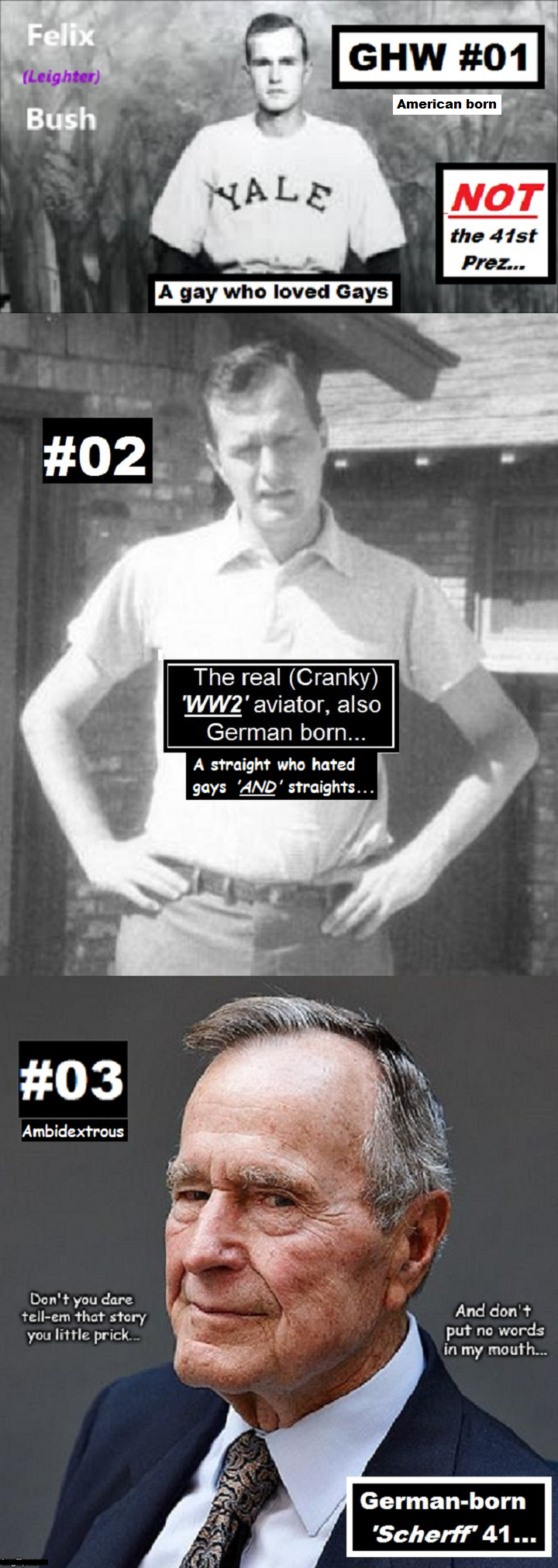 Then your German born 41st president and his brother did five older Aboriginal children in front of me in the same way, the last one relentlessly screamed for a good 25 minutes… As it was they’d later found out the whole thing was filmed by their bosses, and look where Rumsfeld and Cheney wound up in the ‘911’ attacks if you’d just think about it some, after you factor in “41’s role in the Young Republicans” and his Reaganomics…