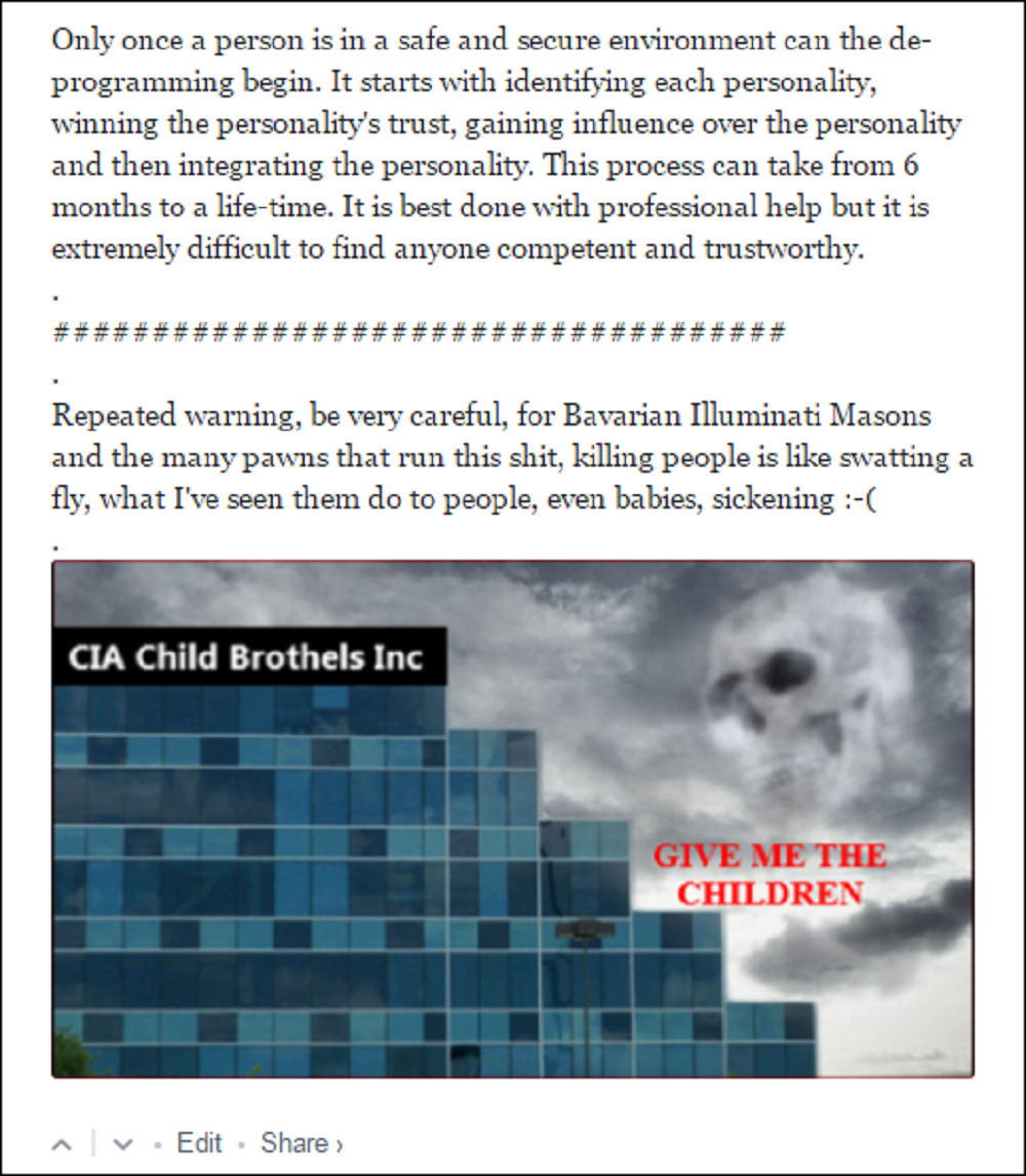 WARNING: Merely identifying a Monarch is extremely dangerous to the victim and the person identifying them. A Monarch can be worth a great deal to their controllers and exposing one can put the exposer’s and Monarch’s life at risk. Trying to help a Monarch is virtually impossible without a lot of training in dealing with mind-control and a properly equipped facility. Most Monarchs have built-in self-destruct programs that are automatically activated if they are discovered and efforts are made to deprogram them. However, a number of Monarchs have broken free and successfully been deprogrammed, or so it seems. The field of psychiatry does not officially recognize trauma-based mind control and any victim of mind control seeking help from the mental health care industry will likely find little help and will put themselves at risk. The various people who offer help to mind control victims are almost always fronts for intelligence agencies. Hypnotic regression in a controlled environment is one of the best techniques for uncovering and integrating the multiple personalities. However, very few people trained in hypnotherapy are remotely qualified for such a job.
