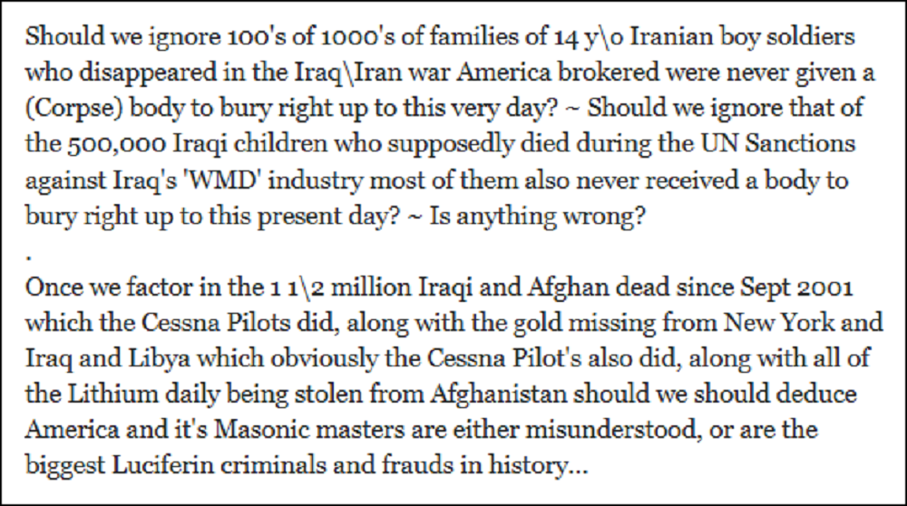 Speaking of invisible things, the 500,000 missing Iraqi children, missing in the 1990’s after the original Saddam Hussein also went missing are, like the good lord almighty above, also invisible now according to America? ~ Oh that’s right, the official story claims they just died cause of America’s trade embargo etcetera, while certain Iraqi’s claim the deaths were just a cover story, they were abducted and taken to serve one purpose or another in the world underground bunker system…