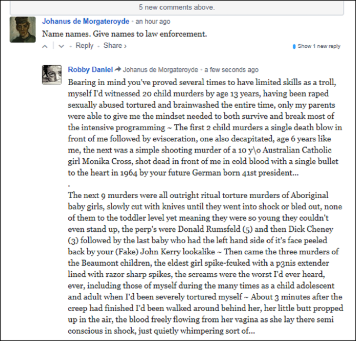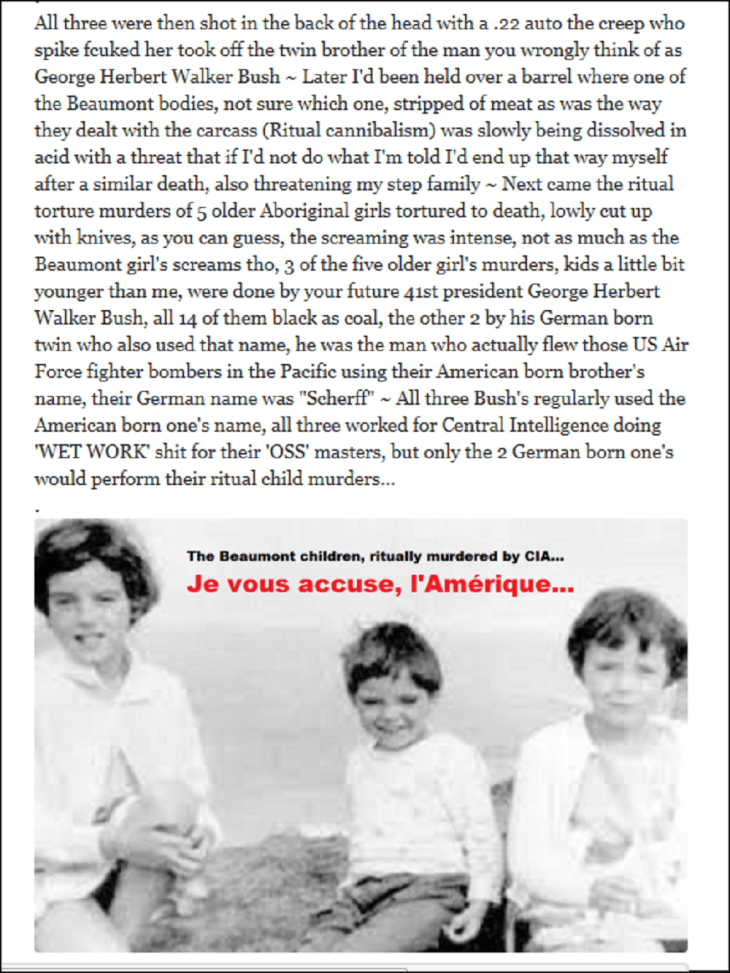 I’d witnessed 20 child murders by age 13 years, having been raped sexually abused tortured and brainwashed the entire time, only my parents were able to give me the mindset needed to both survive and break most of the intensive programming ~ The first 2 child murders a single death blow in front of me followed by evisceration, one also decapitated, age 6 years like me, the next was a simple shooting murder of a 10 y\o Australian Catholic girl Monika Cross, shot dead in front of me in cold blood with a single bullet to the heart in 1964 by the future German born 41st American president ~ The next 9 murders were all outright ritual torture murders of Aboriginal baby girls, slowly cut with knives until they went into shock or bled out, none of them to the toddler level yet meaning they were so young they couldn’t even stand up, the perp’s were Donald Rumsfeld (5) and then Dick Cheney (3) followed by the last baby who had the left hand side of it’s face peeled back by American state’s (Fake) John Kerry lookalike ~ Then came the three murders of the Beaumont children, the eldest girl spike-fcuked with a p3nis extender lined with razor sharp spikes, the screams were the worst I’d ever heard, ever, including those of myself during the many times as a child adolescent and adult when I’d been severely tortured myself ~ About 3 minutes after the creep had finished I’d been walked around behind her, her little butt propped up in the air, the blood freely flowing from her vagina as she lay there semi conscious in shock, just quietly whimpering sort of ~ All three were then shot in the back of the head with a .22 auto the creep who spike fcuked her took off the twin brother of the man you wrongly think of as George Herbert Walker Bush ~ Later I’d been held over a barrel where one of the Beaumont bodies, not sure which one, already stripped of meat as was the way they dealt with the carcass (Ritual cannibalism) was slowly being dissolved in acid with a threat that if I’d not do what I’m told I’d end up that way myself after a similar death, also threatening my step family ~ Next came the ritual torture murders of 5 older Aboriginal girls tortured to death, lowly cut up with knives, as you can guess, the screaming was intense, not as much as the Beaumont girl’s screams tho, 3 of the five older girl’s murders, kids a little bit younger than me, were done by America’s future 41st president George Herbert Walker Bush, all 14 of them black as coal, the other 2 by his German born twin who also used that name, he was the man who actually flew those US Air Force fighter bombers in the Pacific using their American born brother’s name, their German name was “Scherff” ~ All three Bush’s regularly used the American born one’s name, all three worked for Central Intelligence doing ‘WET WORK’ shit for their ‘OSS’ masters, but only the 2 German born one’s would perform their ritual child murders…