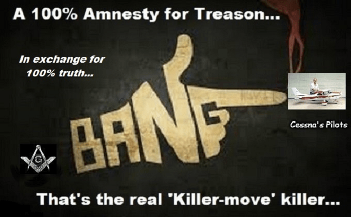 A 100% treason amnesty encompassing both acts of treason and anything that was used over the years and indeed decades the person was a part of the Young Republican treason, things like pedophilia or ritual murders or financial irregularities that led up to them participating in the treason the Masonic machine has pulled on America these last 60 years, ever since your German born ’41’ used his brother’s identity to steal that hydrogen bomb from the US Air Force they claim their just ‘LOST’ (sic) over the Florida everglades or wherever it was, and then a supposedly dead Nazi Adolph Eichmann was tasked to stick it under your congress using the old Masonic tunnels there, all done with the help of a politically blackmailed future Defense Secretary and Vice President Dick Cheney and a politically blackmailed future Assistant Defense Secretary, Deputy ‘NSA’ Director and future Defense Secretary on Sept 11 2001, Donald Rumsfeld, before he (Eichmann) shot your 35th president dead 2 weeks before the Dealy Plaza sham and your Central Intelligence Agency turned your world upside down with that magic bullet bolt action rifle fantasy ~ Taking all of that into account, and it’s all factual and accurate, that is why a 100% treason amnesty is the only thing that could empower both those who accurately and articulately know the finer details of what happened these last six decades of Masonic treason in America, including those in the black op’s side of your Govt’s intelligence circles spilling what they know, what they saw, as well as empower those who by nature of their work know how to go about fixing it, without any reason to fear being set up for speaking out…