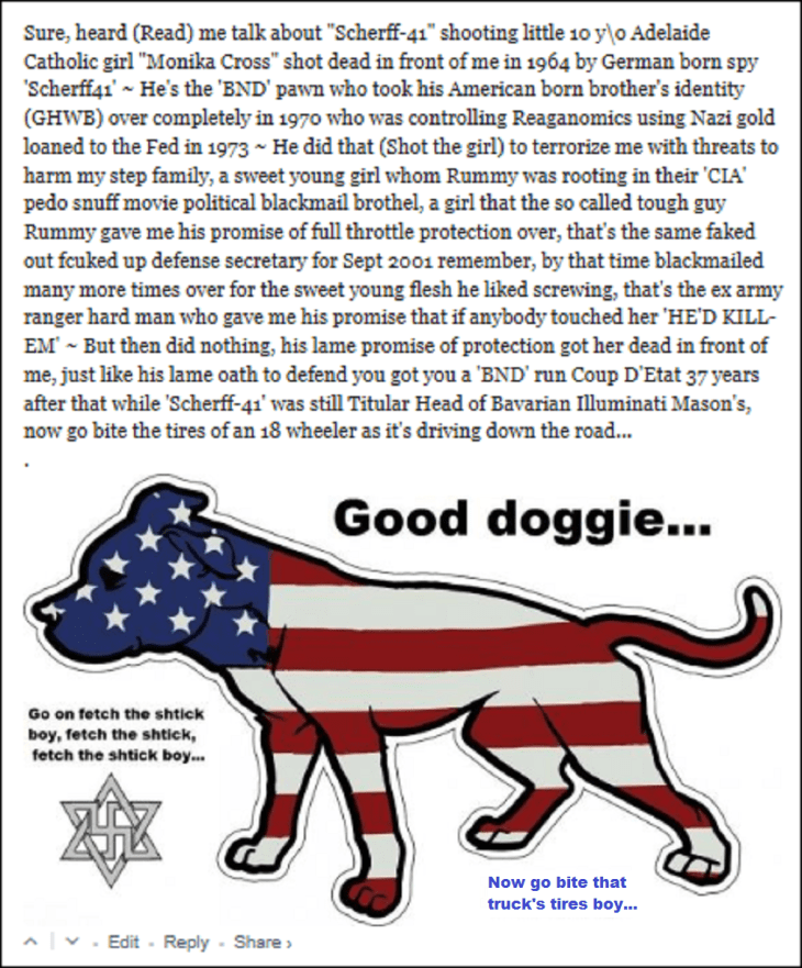 So again, there I-was as a bright 4 y\o with these bastards whom I’d later learnt were ‘CIA’ hurting me and my mom to get at me, either get at me in the hospital as they’d done before in the children’s ward of the Broken Hill hospital or at the Escort House annex of the Adelaide Children’s hospital during my 2 month stay there, or, seeing as I’d not been seriously injured in the car accident, the foster home ~ In addition to being fcuked in the ass for the first time as distinct from the sexual assault and torture previously, two men were shot dead in front of me while I’d been in that foster mother bitch’s care ~ It was the same German born Bush (Scherff) who did both, those first two murders, I’m inclined to think it was the same one who later became America’s ’41’ yet I’m not crystal clear there, not 100% as both were like twins, matter of fact I’d heard they probably were twins ~ The first time this guy was standing there and he just shot him, shot him dead in cold blood, then he (41?) looked at me after and kind of strutted while standing still as if to look tough and say “Well what do you think of that then” and I’d just laughed at him, belly laughed at him in real mirth cause I’d just been a kid and this fool was trying to act tough at me, “Strutting while standing still” were the words I’d thought of at the time, something our dad had told us about people acting tough to kid’s not to be taken seriously lurking in the back of my mind that made me laugh instead of cringe in fear ~ The 2nd one was more convoluted, he (41?) told me first before he brought the guy into the room that he was a really nice guy and he hated to have to do to him what he was going to have to do, which, at the time, I’d had no idea whatever that was nor cared in the least, either before or after, didn’t give a damn back then and still don’t 56 years later ~ First, he made him kneel down in front of him and the guy started begging for his life, he was really begging, saying shit like “You’re gonna kill me, I-know you’re gonna kill me, I-don’t want to die” to which he (Bush #03?) replied “I’m not going to kill you dammit, just kneel down” at which point after a bit of quick banter after he’d knelt down, words I’d not caught the gist of, he shot him in the throat…
