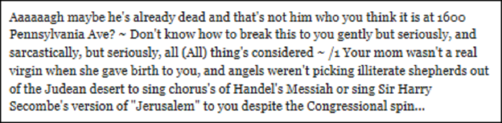 Of course those who claim Muslim Cessna Pilot’s pulled ‘911’ will say they’re not lying, instead they’ll claim it’s me lying, but seriously, read the occasionally absurd sad or silly little political puns here, yet look for a bigger logic within them, look at the level of taxpayer funded idiocy thrown at me on the fake ‘PP’ news website, then go read other comments towards the bottom of this blog, some of them from the same page no less, other’s, like some of the religious occultist or philosophical perspectives repeated because people need to learn before they die not just what this world’s Luciferin leader’s are lying about, but also learn why they’re lying…