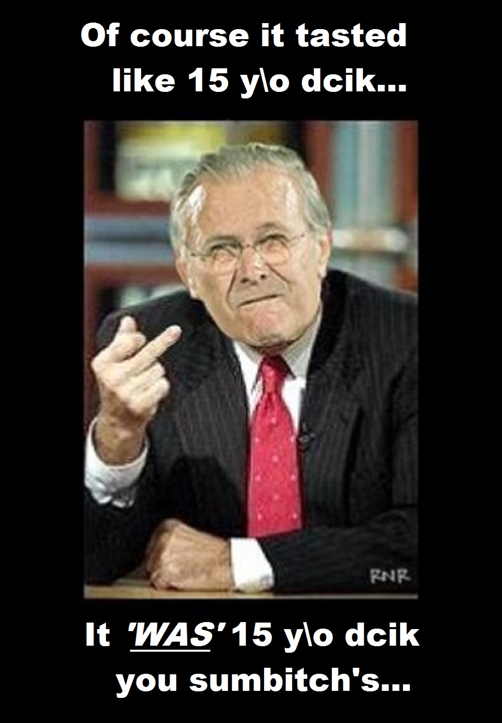 So anyway, there’s over 95% of hard cold fact in these blogs of mine but there’s also fact expressed as puns, quite humorous puns some of them, but know this, pretty well everything else in the blog is dead serious, including witnessing Don Rumsfeld, Dick Cheney, the fake Kerry, and the two German born sons of Prescott Bush, both of whom by the way worked for the ‘BND’ within the US Govt and one of whom later illegally became America’s 41st president, ritually torture-murder 9 coal black full blood Aboriginal babies and 5 older full blood Aboriginal children to death in front of me in the 1960’s in a ‘CIA’ run pedo snuff movie brothel I’d been trapped in from age four years old ~ It was a pedo brothel in which I’d been raped prostituted tortured and literally given drug based “MK Ultra” brainwashing in for my entire childhood from age 4 years to age 18 years, press-ganged rent boy if you will, the torture brainwashing and sexual assaults actually beginning at only 2 years of age while the full blown ass raping anal prostitution didn’t begin until 4 years of age ~ In effect I’m a witness to crimes against humanity, I’m not a fool or a troublemaker, or even a bloody comedian as such, merely an honest witness ~ It just happened that for one reason or another either the omnipotent omnipresent angry invisible Abrahamic cosmic magi or his other Abrahamic (Snicker) half ‘Lucifer’ gave me truth, wisdom, a knowledge of philosophical and occultist concepts, and a fcuking sense of humor ~ Enjoy if you will, but, show a little appreciation for the art, if not politique…