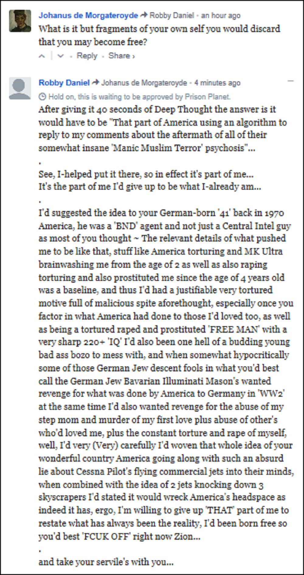 Of course those who claim Muslim Cessna Pilot’s pulled ‘911’ will say they’re not lying, instead they’ll claim it’s me lying, but seriously, read the occasionally absurd sad or silly little political puns here, yet look for a bigger logic within them, look at the level of taxpayer funded idiocy thrown at me on the fake ‘PP’ news website, then go read other comments towards the bottom of this blog, some of them from the same page no less, other’s, like some of the religious occultist or philosophical perspectives repeated because people need to learn before they die not just what this world’s Luciferin leader’s are lying about, but also learn why they’re lying…
