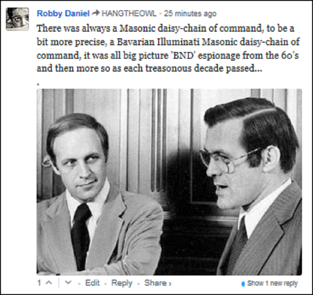 Once again, for the fainthearted and the slow witted, there was only ‘ONE’ group and one group only with the means motive and opportunity to pull off the Sept 2001 attacks on New York and the Pentagon ~ That group was not just Freemason’s, average Mason’s didn’t have the authority or indeed the US Fed cash to facilitate Zion’s real world command control thru political blackmail, illegally set up in part by your heavily compromised Central Intelligence agency + ‘NSA’ (Which Rumsfeld once controlled) and your ‘FBI’ in it’s pedophile dungeon network shame ~ The one group that had access to all lever’s of all level’s of treason within the Masonic Lodge was those Mason’s in part called the Young Republican’s by some, under the control of the masters of that shadowy group called “Bavarian Illuminati” which one way or the other, by stealth, has been dogging your nation via the top four levels of Masonry, those it’s effectively solely controlled from 1670 until now, dogging you ever since Adam Weishaupt first taught his young protégé Thomas Jefferson how to grow top notch Sinsemilla weed while teaching Washington the joys of shaving his butt for a cleaner cuter more illuminated brand of Masonic Jewish kabala butt-based sexuality…