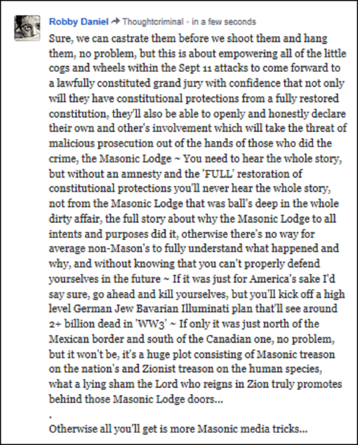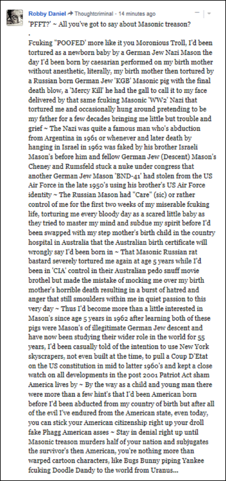 So perhaps the real reason for this idiot subnet isn’t always about protecting the Sept 2001 plotters for the Sept 2001 crimes after all, maybe this fake subnet website, designed as it is to try to make me look stupid for posting on it, is really designed to protect 5 American Freemason’s whom I’d witnessed committing the worst kind of human rights abuses and atrocities known to man, the ritual Jewish kabala torture murders of babies and children ~ Yet America’s hypocrites wonder why occasionally I’ll say ‘DAMN YOU’ along with other well chosen negative epithets? ~ That was 20 child murders I’d seen those pigs in ‘CIA’ pull from 1963 to late 1969 and 14 of them were outright torture murders by those five men I’ve just identified…