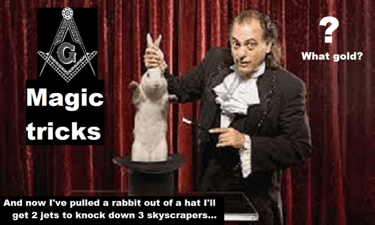 ‘NORAD’ down for 2 hours and the Air Force off to Alaska by Rumsfeld so their 120 mile attack radars could not prove there were no jets, the minutiae of the mass media feed of fake videos and stories like that wing falling off the jet in a Pentagon car park given to deliberately confuse people, getting most of the ‘WTC’ gold safely off to Germany 2 weeks prior to the attacks by the inner mechanism’s of your own hidden Masonic Govt, these were all things that no average Mason could cause, merely participate in under orders, orders they obeyed due to fear, weakness, blackmail, greed, stupidity, or all of the above, nope, it was that section of the Masonic Lodge specially pushed to the foreground of financial power and political control by your German born 41st president, one of the greatest true espionage double agents in the history of the modern nation state warring on another state peacefully…