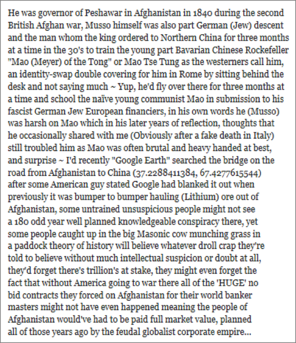 This man pictured above, one supposedly hung in 1945 next to his common law wife Clara Petrucci, hung by the Masonic partisan’s, he told me in 1972 or thereabouts that the reason the world was such a fcuking idiotic train wreck was as follows…
