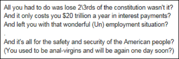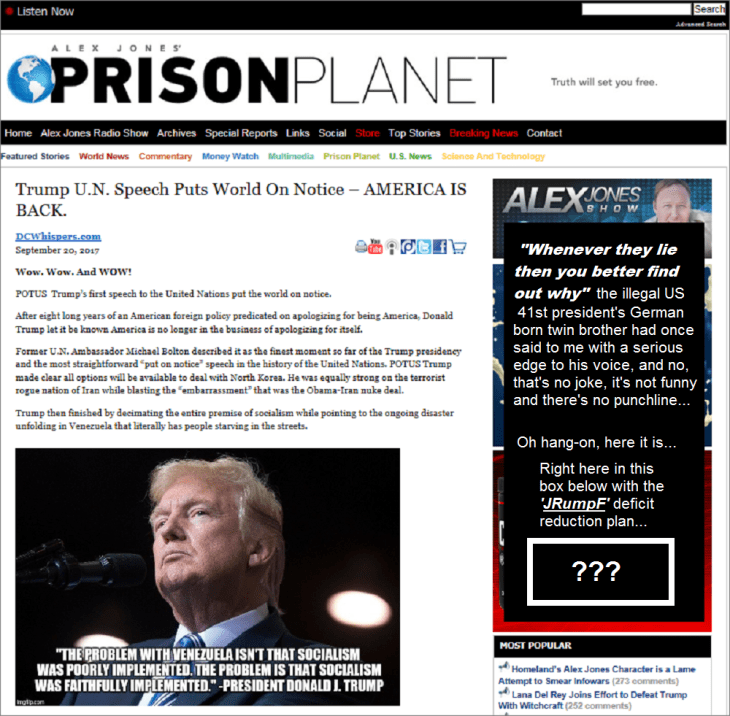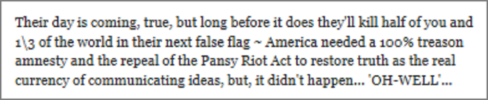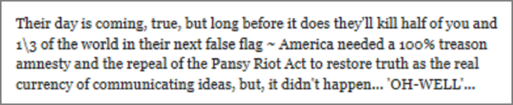 For the record, most if not all of the posters on the once real now 100% fake US Govt Cyber Security “Prison Planet” subnet website are paid posters, often multiple posters working for various parts of the US Govt or it’s political media using the same account at different times, all keeping to a ‘SCRIPT’ of sorts, a set of fairly well defined parameters or guidelines about what they can say and what they can’t, all directly or indirectly paid for by the US taxpayer, supposedly on the basis of it being for “The safety and security of the American people” ~ The reality is far removed from that though, in all truth it’s all about maintaining “The safety and security of the Freemason’s who pulled the Sept 11 2001 attacks” but never mind that for the moment ~ It’s also served a purpose as a whiteboard of sorts for these blogs of mine, yet seriously, there’s even more afoot than just confusing and distorting people’s perspectives of recent political events (Crimes) that the insider’s of Washington want blurred…