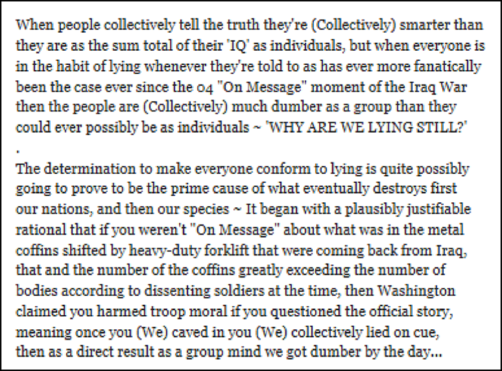 READ MY LIPS… “They (Zion) destroy the decade ahead with the lies they use to hide their previous 5 decades”… I’d actually felt like kicking him in the shins for being so god damn logical with a quick answer when he said that, because according to what I’d already understood about the human condition (sic) it immediately seemed both plausible and logical, then after considering what he’d said for a few months within the avalanche of accurate stuff I’d already learned at that time simply by being honest while keeping my eyes and ears wide open, much like a hawk hunting prey from the age of 5 years old onwards, never once dismissing a single seemingly inane perspective just because it contradicted anything else I’d wanted to cling to for comfort, a serious little lateral heavyweight thinker who weighed every lateral perspective with severe empirical values, a damn site harder than it sounds for a university student or professor let alone a tortured abused terrorised angry little boy with a budding 220 ‘IQ’ that made ‘EVERYTHING’ interesting one way or the other, partly because I’d learnt that once you master your subject even a lie can illuminate truth’s if you learn the purpose of the lie, well after considering what he’d said for a few more months after I’d felt like kicking him in the shins again just for being so god damned right…