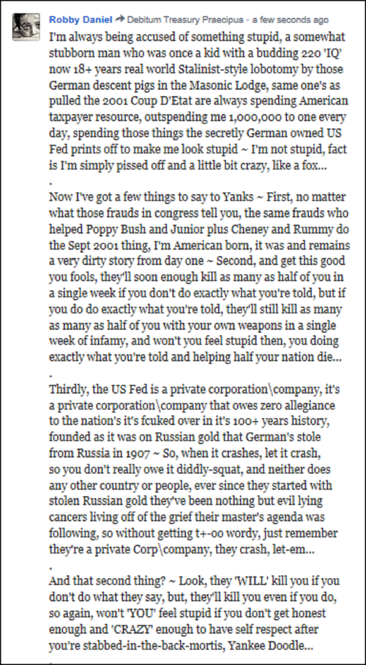 Don’t mind me, it’s not sarcasm, just a bit of humor, bit of lateral silly before the serious stuff starts, comments on stuff like the US Fed being a private secretly German owned (Controlled) company that you could, and should, allow to go bankrupt before you honor debts to them, instead of paying them, you should honor your debts to countries and individuals with dollars that ‘YOU’ print, rather than they print..