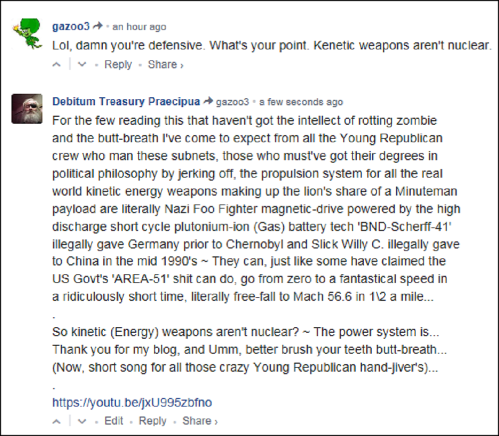 And there you have it, a longish blog detailing why America, and the world at large, will most likely be decimated by a long planned Masonic run ‘WW3’ because American’s were either too stupid, or too gutless, to create that million man\woman ex military march and sit in on the lawns of Capital Hill in Washington to demand a fully legislated 100% amnesty on treason going back 60 years simply in exchange for telling 100% of the truth to a lawfully constituted grand jury, thus releasing those among them who possess the knowledge of what was done, and perhaps how to undo it, that’s what the amnesty is for you stupid Yankee fools, to allow dissenting insiders a chance to risk their lives giving evidence on what they know, perhaps contributing to the understanding of greater America, then thru a mass awakening of the average inbred American hillbilly redneck moron maybe even frustrating the genocidal Masonic agenda giving more people time to spiritually grow, it’s worth a try before the kinetic energy weapons in the Minutemen payload are dropped on you…