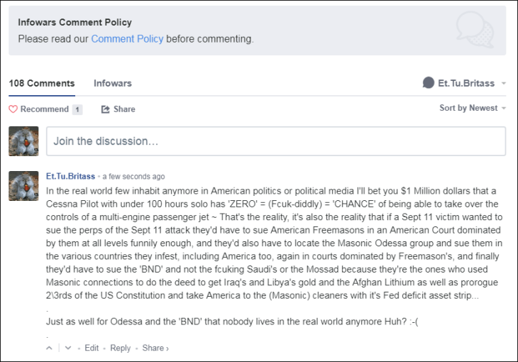 In the real world few inhabit anymore in American politics or political media I’ll bet you $1 Million dollars that a Cessna Pilot with under 100 hours solo has ‘ZERO’ = fcuk diddly = ‘CHANCE’ of being able to take over the controls of a multi-engine passenger jet, that’s the reality ~ It’s also the reality that if a Sept 11 victim wanted to sue the perps of the Sept 11 attack they’d have to sue American Freemasons in an American Court dominated by them at all levels funnily enough, and they’d also have to locate the Masonic Odessa group and sue them in the various countries they infest, including America too, again in courts dominated by Freemason’s, and finally they’d have to sue the ‘BND’ and not the fcuking Saudi’s or the Mossad because they’re the ones who used Masonic connections to do the deed to get Iraq’s and Libya’s gold and the Afghan Lithium as well as prorogue 2\3rds of the US Constitution and take America to the (Masonic) cleaners with it’s Fed deficit asset strip ~ Just as well for Odessa and the ‘BND’ that nobody lives in the real world anymore Huh? 😦